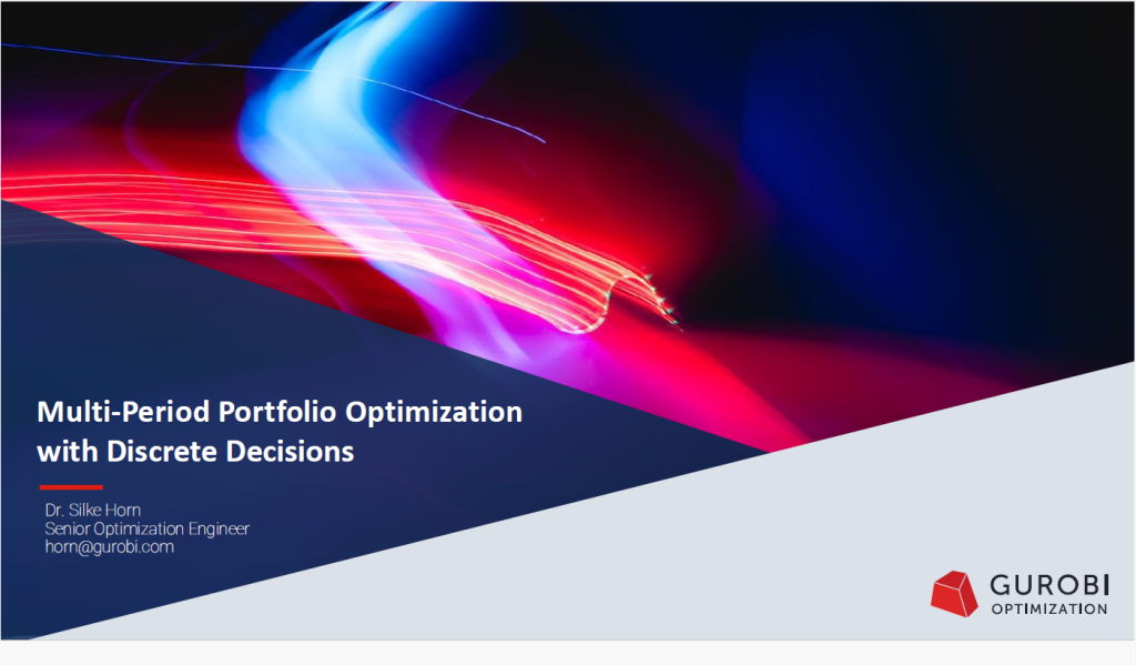 Portfolio decisions are made repeatedly and each rebalancing is subject to transaction costs, turnover limits, and discrete asset selection constraints that affect future flexibility. Capturing these effects requires moving beyond single-period models to multi-period optimization. In this session, we demonstrate how multi-period portfolio problems can be formulated and solved as mixed-integer optimization models using Gurobi. We show how to model position dynamics across time, incorporate realistic discrete features such as cardinality constraints, transaction costs, and minimum trade sizes, and account for how these decisions interact across rebalancing periods in a backtesting setting. Because backtesting requires solving many related optimization problems, solver performance becomes a key practical consideration. We also share modeling best practices and practical insights for scaling multi-period mixed-integer models efficiently - Dr. Silke Horn, Senior Optimization Engineer, Gurobi.