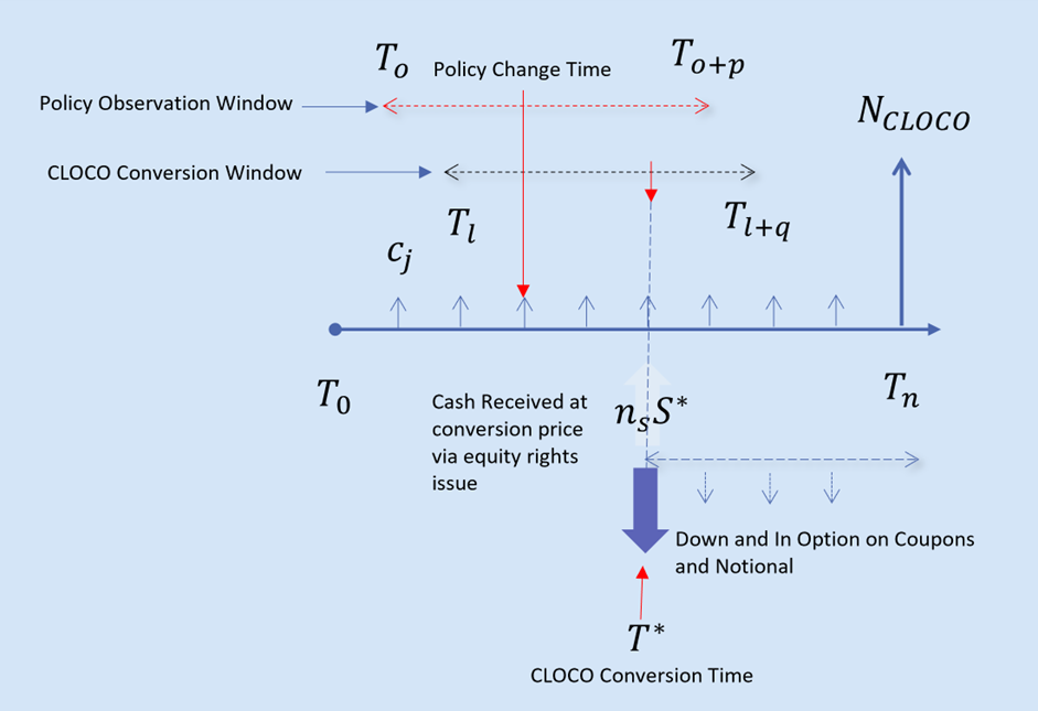 Figure 1: Cashflow diagram of the coupon bearing CloCo bond, the conversion mechanism is via a cash pay out to bond holders from the rights issue mechanism.